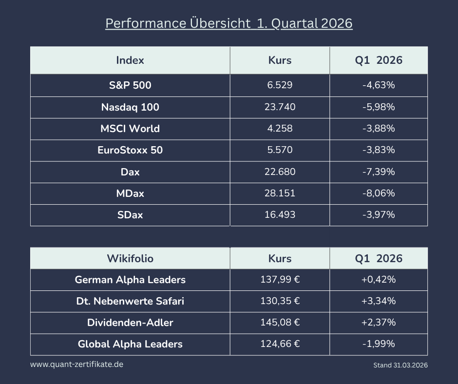 Besonders deutlich fiel die Korrektur dagegen in Deutschland aus. Der DAX verlor im ersten Quartal 7,39 % und gehörte damit zu den schwächeren großen Aktienmärkten. Der MDAX entwickelte sich mit -8,06 % noch schwächer, während der SDAX mit -3,97 % etwas stabiler blieb.
